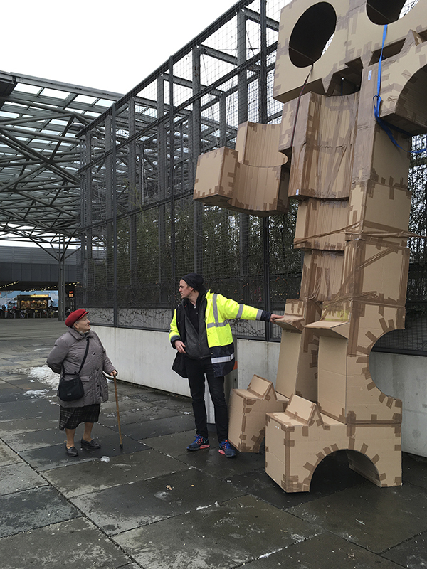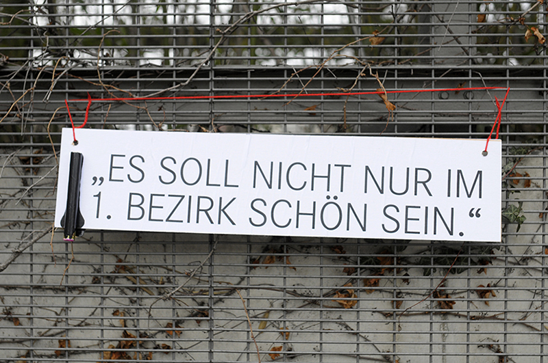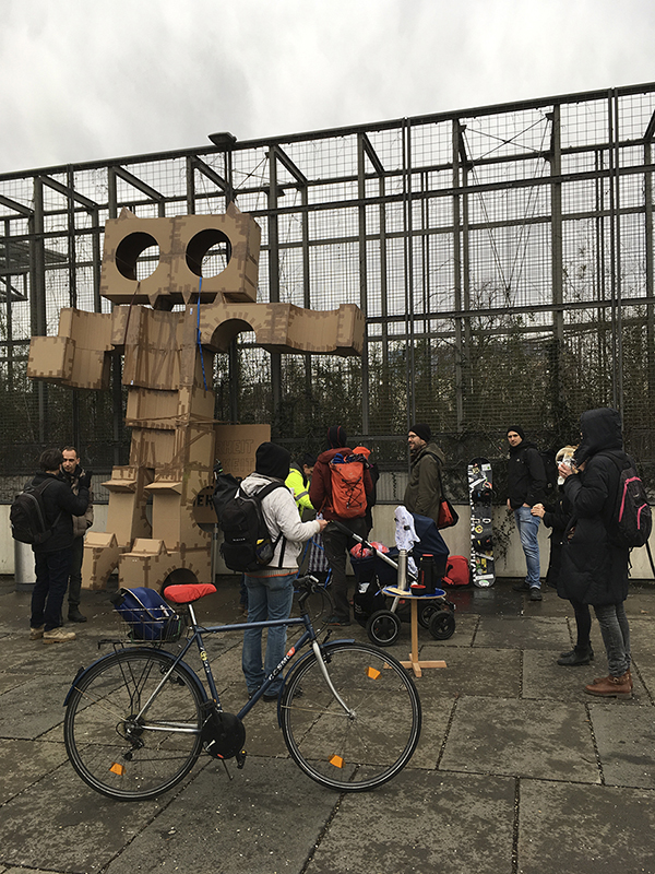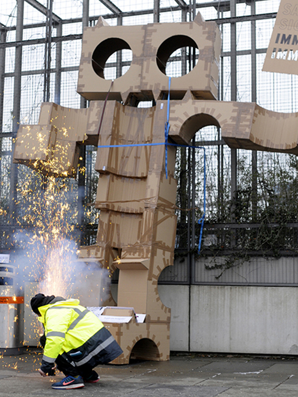 "Draußen am Vorplatz wachte inzwischen das überdimensionierte Pappendeckelmonster über „Sicherkeit und Sauberheit“, eine Ausstellung aus Zeitungsschnipseln lud zur Schnellreflexion über Stadtentwicklung ein, und neben magenwärmdendem Glühkompott gab es zu guter Letzt auch noch ein Feuerwerk." (augustin / hier)