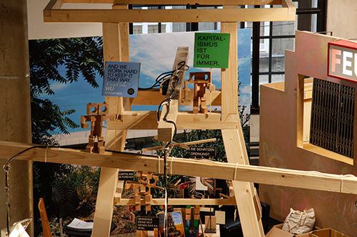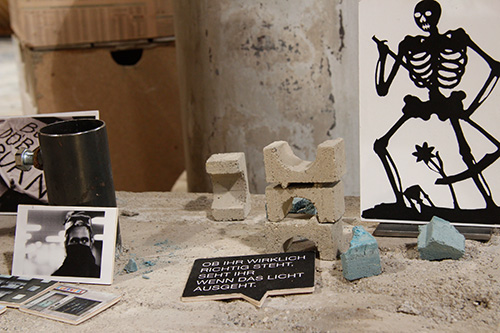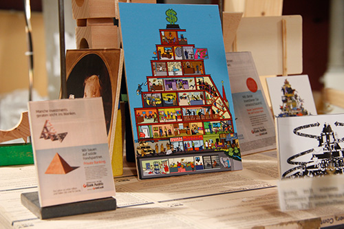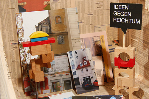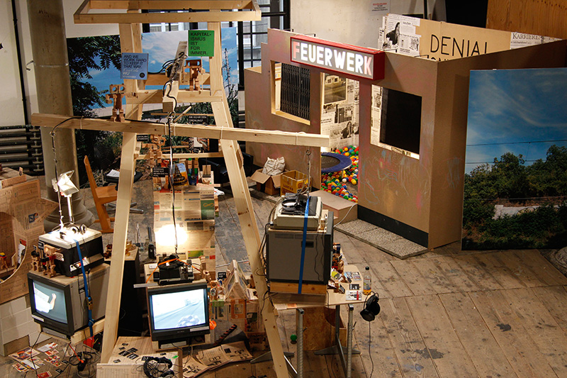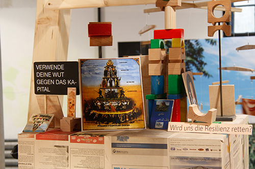 Zum Zweifeltower: 3 Filme und 3 Hörstücke reflektieren meine Recherchen zur Geschichte der Geschichtswerkstätten. Bausteine, Recherche-Schnipsel, Karriere-Monster tummeln sich im Turm. Im Hintergrund steht der kleine Feuerwerksladen vom Matzleinsdorferplatz. Und Disteln.